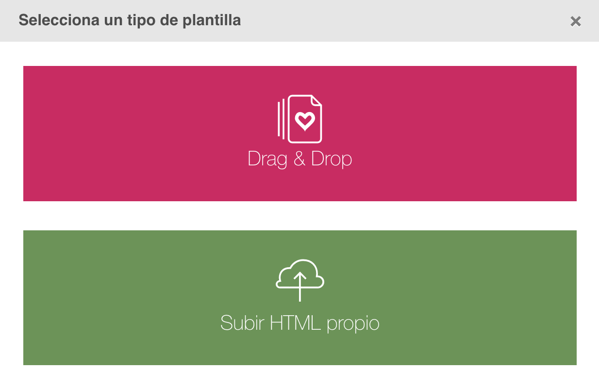 Para crear una plantilla a partir de un archivo html comprimido en formato .zip, se debe seleccionar el tipo de contenido "Subir HTML propio"