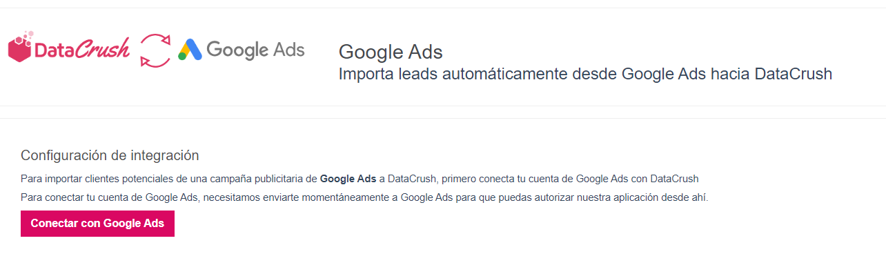 Para comenzar con esta integración es necesario conectar una cuenta de Google Ads que sea administradora de las campañas desde donde se quieran obtener los leads.