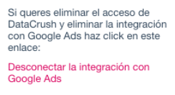 Es posible desconectar completamente la integración con Google Ads, para lo cual se deberá presionar el enlace Desconectar integración con Google Ads que se encuentra en el recuadro izquierdo.