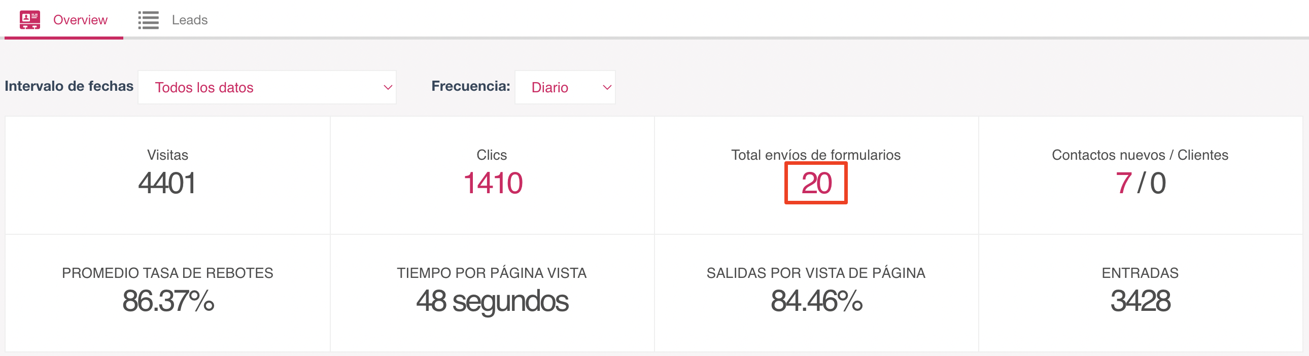 Dentro de las estadísticas principales "Overview" podrás ver la cantidad de contactos que completaron el formulario. Haciendo click sobre el valor total, en este caso haciendo click sobre el valor "20" se mostrará una ventana que te permitirá exportar todos los contactos.