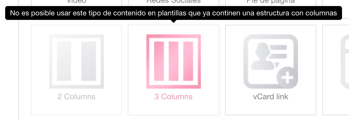 Si la plantilla utilizada para crear la nueva plantilla, ya incluye columnas, no será posible agregar el contenido “Columnas”. Este tipo de contenido no es posible de utilizar cuando ya se utiliza una estructura que contiene columnas.